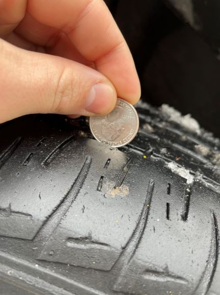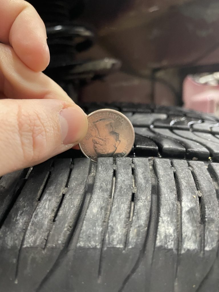 We have talked about wear frequently in tips 1 and 2, and this can actually be measured. The Ohio state law says that your vehicle is required to have at least 2/32″ tread depth on your tires, but most industry experts suggest replacing them at 4/32″. If your tires have low tread depth, they can not grip the road as easily, especially in wet conditions, which puts the driver at a major risk for hydroplaning and even sliding when applying brakes. In order to check, you can purchase a tread depth gauge from your local auto parts store, or, you can just use a quarter. Just take a Quarter and place it in your tire’s tread with George Washington’s head facing down. If you can’t see George’s head, your tires are okay. However, if you can see the top of his head, your tires are below 4/32″ and you should start looking for your next set of tires. Checking your tread depth is important, and you should check regularly to keep yourself, and others, safe on the road.